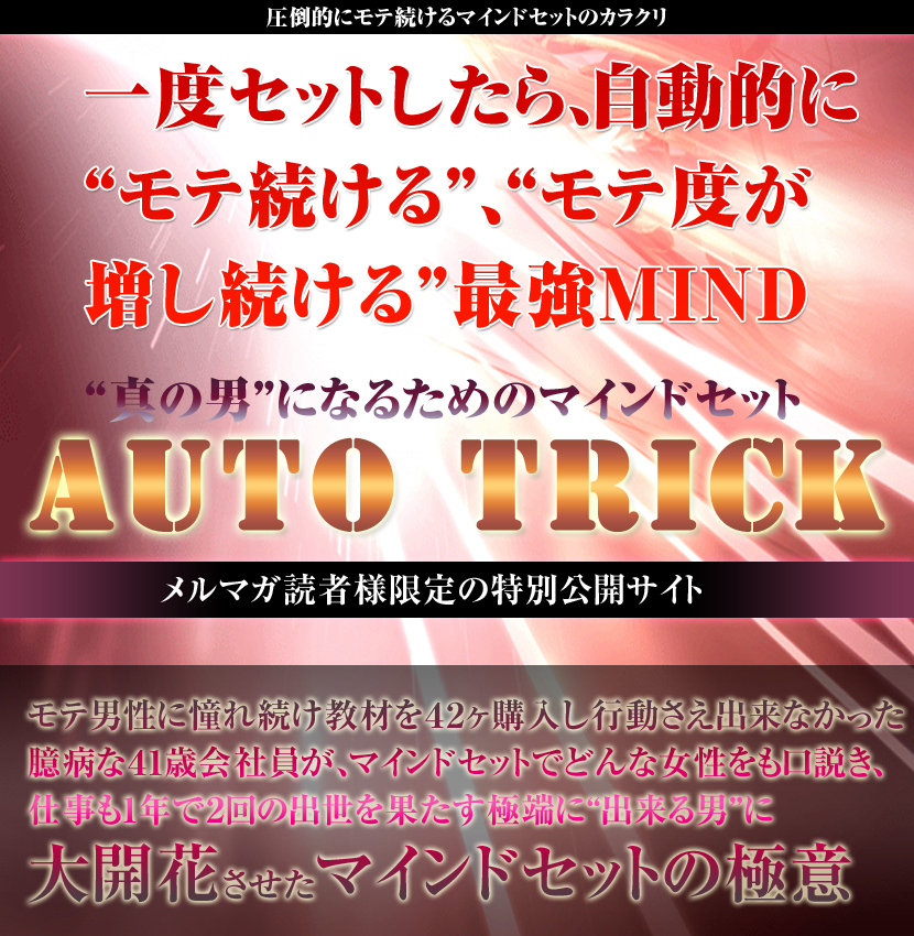 そんなときAUTO TRICKに出会い、半信半疑で試してみました。 それが仕事や恋愛面にもいい影響となって現れてきました。