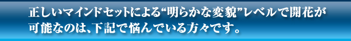どうにかして短期間で自分が変わることはないかと考えていたところに、 このマインドセットと出会い、実行してみたところ、なんだか自分の中での意識がかわり、 それに伴って周りの反応も少しずつ違ってくるのを感じました。